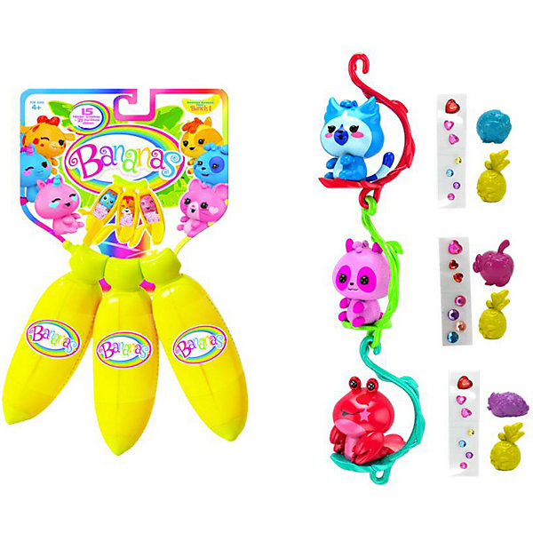 В наборе грозди жёлтых бананов. Кожура с одной стороны открывается, а внутри прячутся забавные фигурки различных животных, какие именно – сюрприз. Также в комплект входят лианы с подставками, на которые можно сажать зверят и подвешивать друг за друга, две фигурки еды для каждого питомцы и стразы, которыми их можно украсить. Изготовлены из качественных и безопасных материалов.