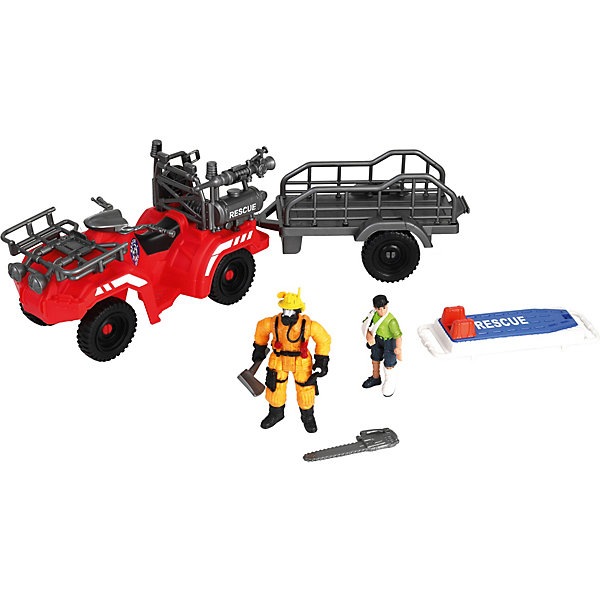 • в наборе: фигурка пожарного, бензопила, топор, фигурка пострадавшего, носилки, спасательный квадроцикл с прицепом