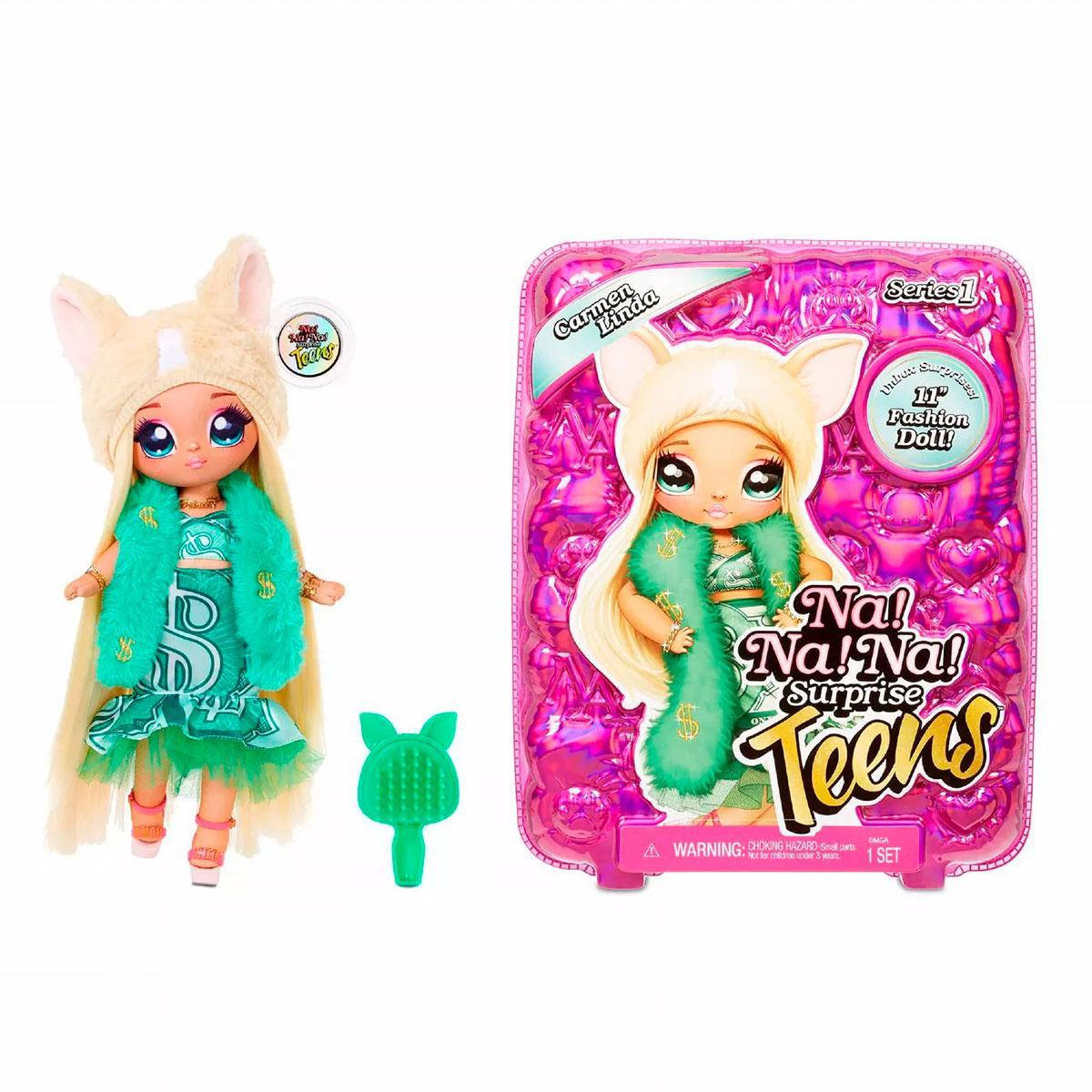 Игровой набор Na! Na! Na! Surprise серии Teens" – Кармен Линда Встречайте новую серию игровых наборов Na! Na! Na! Surprise! "Teens". Эти куклы для девочек относятся к fashion dolls. Они стали выше и подвижнее! С каждой куклой в наборе идут модные аксессуары. Еще одна особенность, которая сделает игру с этими куклами еще интереснее – съемные головные уборы. Теперь их можно примерить и другим Teens!Наряд Кармен Линды выглядит потрясающе! Зеленое платье и меховой шарф в денежных единицах подчеркивают её статус. Эта светловолосая кукла для девочек чем-то похожа на маленьких чихуахуа – она очень милая, а её наряд, несмотря на свой лоск и блеск, говорит об игривом и непоседливом характере. Кармен Линда станет украшением для любой коллекции!Особенности:высота куклы – 28 см большая подвижность у куклы роскошные длинные волосы, которые можно расчесывать в комплекте к каждой кукле идут аксессуары: туфли, модные наряды, съёмный плюшевый головной убор и щетка. В наборе:кукла 28 см аксессуары. Рекомендовано для детей в возрасте от 3 лет."