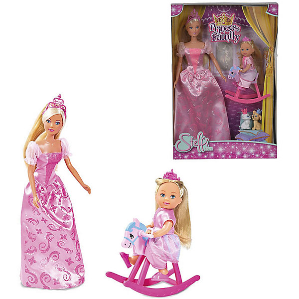 Штеффи и ее дочка обладательницы длинных блестящих волос, которые можно расчесывать. На игрушках наряды принцесс и тиары. У куклы подвижные части тела. Набор подходит для сюжетных игр.