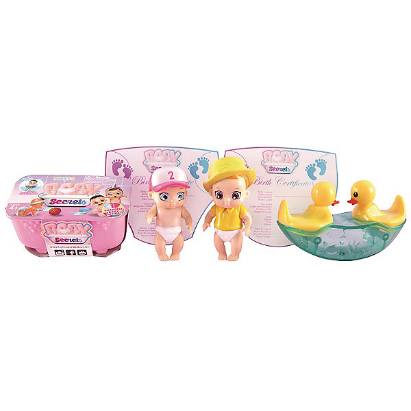 Пупсики одеты в белые подгузники, если в ванну налить холодную воду и поместить их туда, то они окрасятся в розовый или голубой цвета, что будет означать какого пола куколка – мальчик или девочка. А какие именно попались в наборе можно узнать, открыв ванночку. Для малышей в комплекте есть качели-балансир, выполненные в виде жёлтых уточек на зелёном лугу. На них можно сажать и качать детишек. Свидетельства о рождении сделаны в виде подгузников, имеются поля для заполнения имени и пола, даты рождения и графа для мамы.