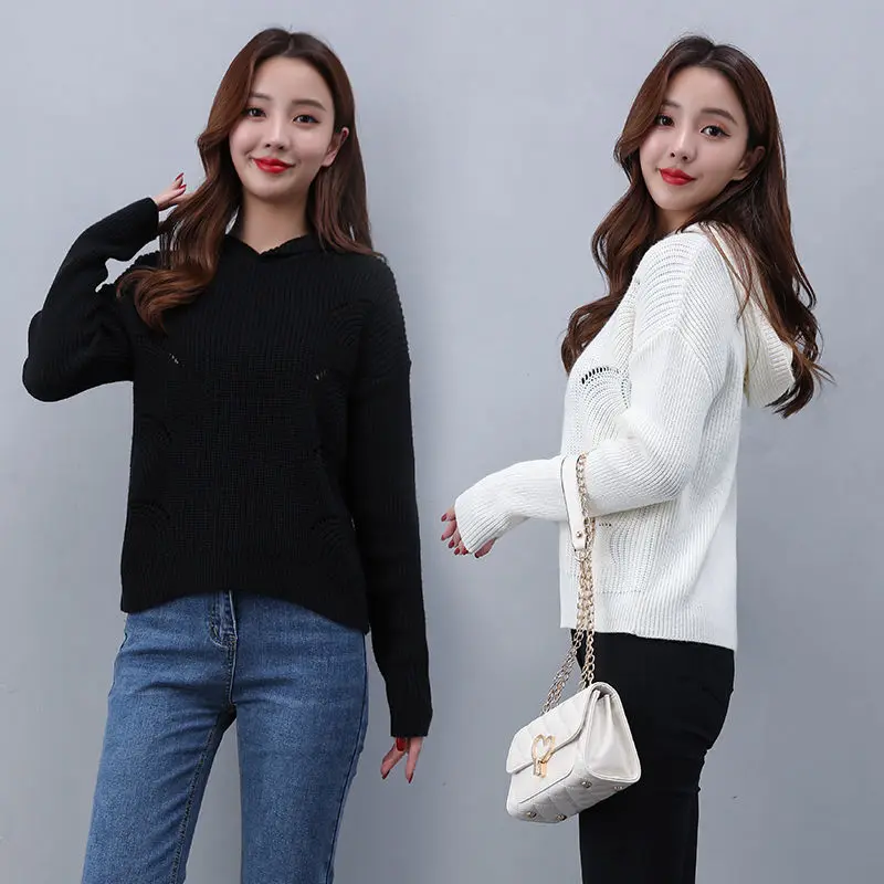 2021 New Autumn Sweater Women Casual Hooded Knitted Sweater Tops Fashion Long Sleeve V-Neck Female Pullover Jumper