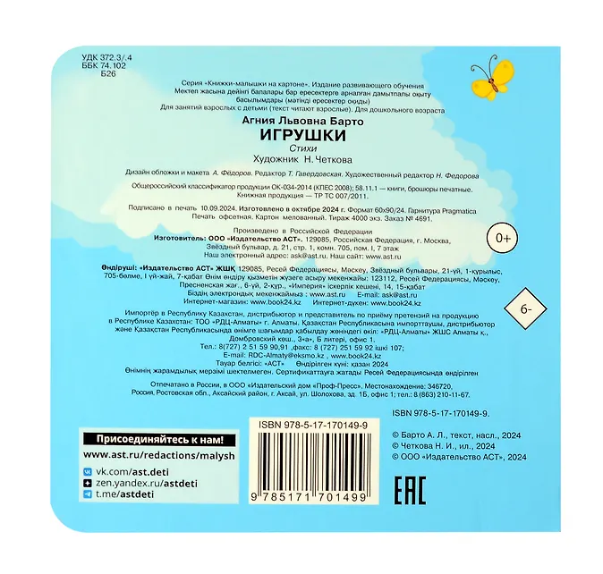 Серия "Книжки-малышки на картоне" идеально подходят для первого знакомства малыша с книгой. Яркие крупные иллюстрации и стихи знаменитого детского писателя Агнии Барто заинтересуют даже самых маленьких непосед. Мелодичные стихи с простой лексикой помогут развить речь ребенка, в игровой форме познакомить его с новыми словами. Плотный картон и скругленные края сделают чтение безопасным и сохранят книгу на долгие годы.