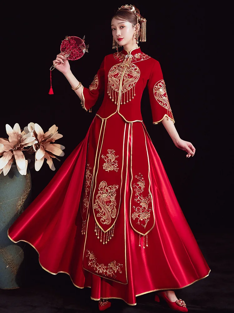 Изысканная вышивка блестками Традиционный китайский Чонсам Свадебный костюм для пары Элегантное свадебное платье для невесты