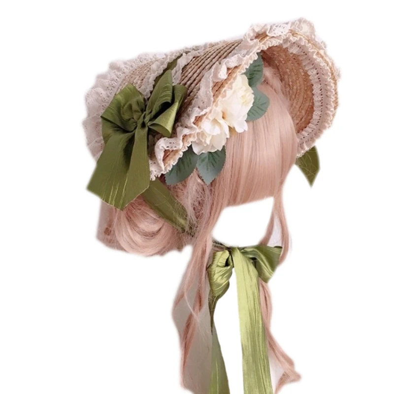 Изысканная шляпа с плоским верхом и кружевной цветочной лентой, шляпа на капоте, универсальная соломенная шляпа Лолита ручной