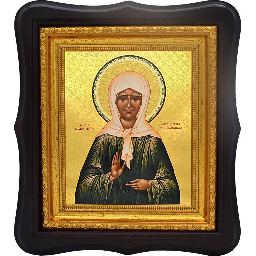 Икона Святой праведной блаженной Матроны Московской помогает во всем, о чем Вы ее ни попросите. Икона создана методом литографии на золотом фоне с двойным рельефным тиснением, вставлена в раму или в киот. Освящена в храме.