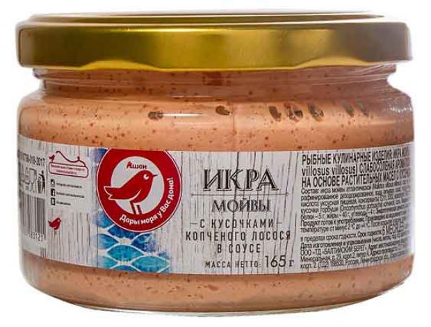 Икра мойвы АШАН в соусе с копченым лососем, 165 г ИКРА РЫБНАЯ СЛАБОСОЛЕНАЯ В СОУСЕ С КУСОЧКАМИ КОПЧЕНОЙ ГОРБУШИ