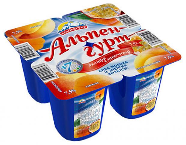 Продукт йогуртный пастеризованный с абрикосом и персик/маракуйя Альпенгурт. Экстра сливочный массовая доля жира 7,5%.