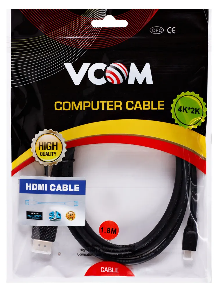 Кабель-переходник (адаптер) HDMI(19M)-Micro HDMI(19M) 4K, v1.4/1.4, экранированный, 1.8 м, черный VCOM (CG587-1.8M)