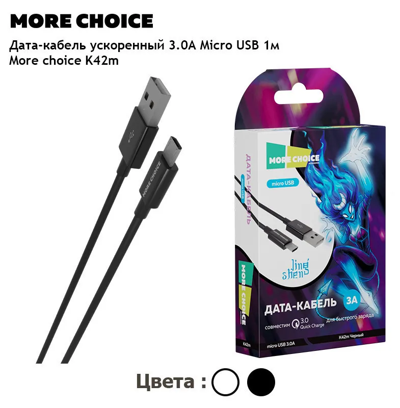Кабель Micro USB-USB, 3A быстрая зарядка, 1м, черный MORE CHOICE K42Sm, K42Sm