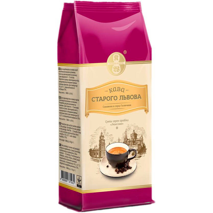 Кофе в зернах Старого Львова Люксовый — 100% натуральный кофе, смесь арабики Эфиопии, арабики Колумбии и арабики Мексики.