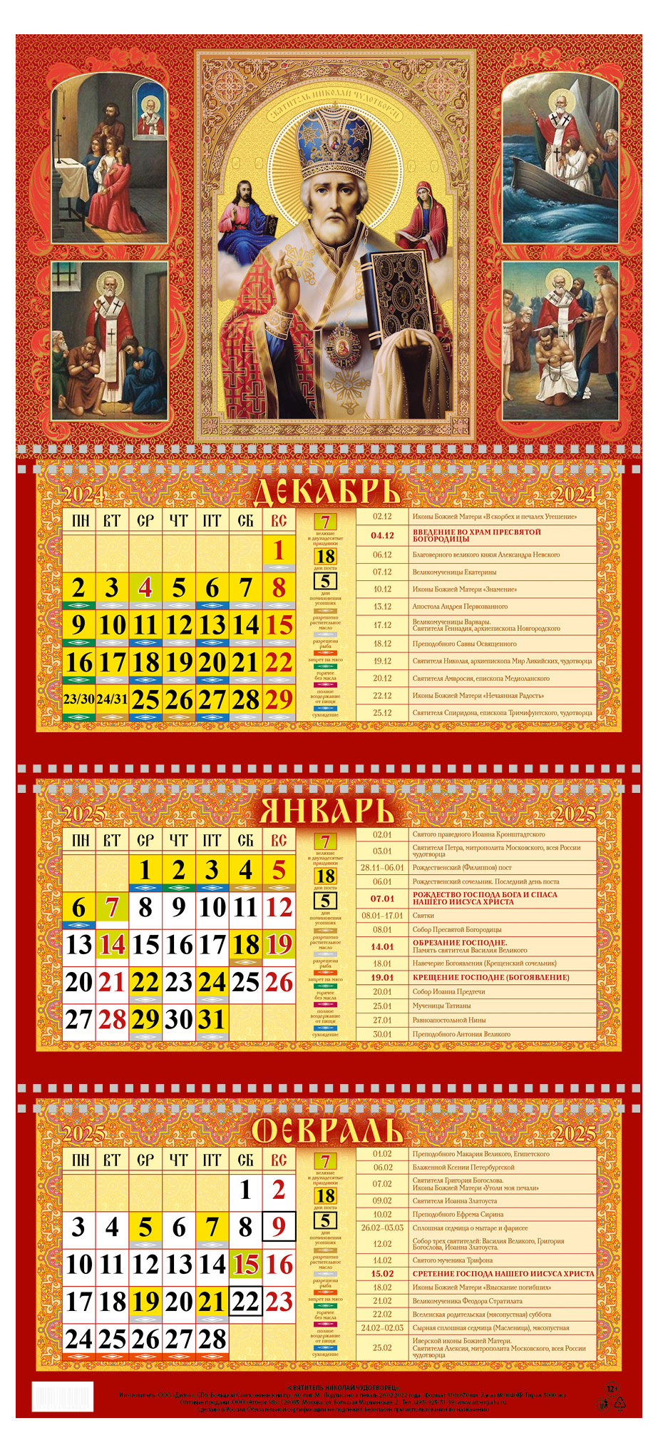 Календарь квартальный Каленарт Святитель Николай Чудотворец золотое тиснение 2025 г, 310х680 мм
