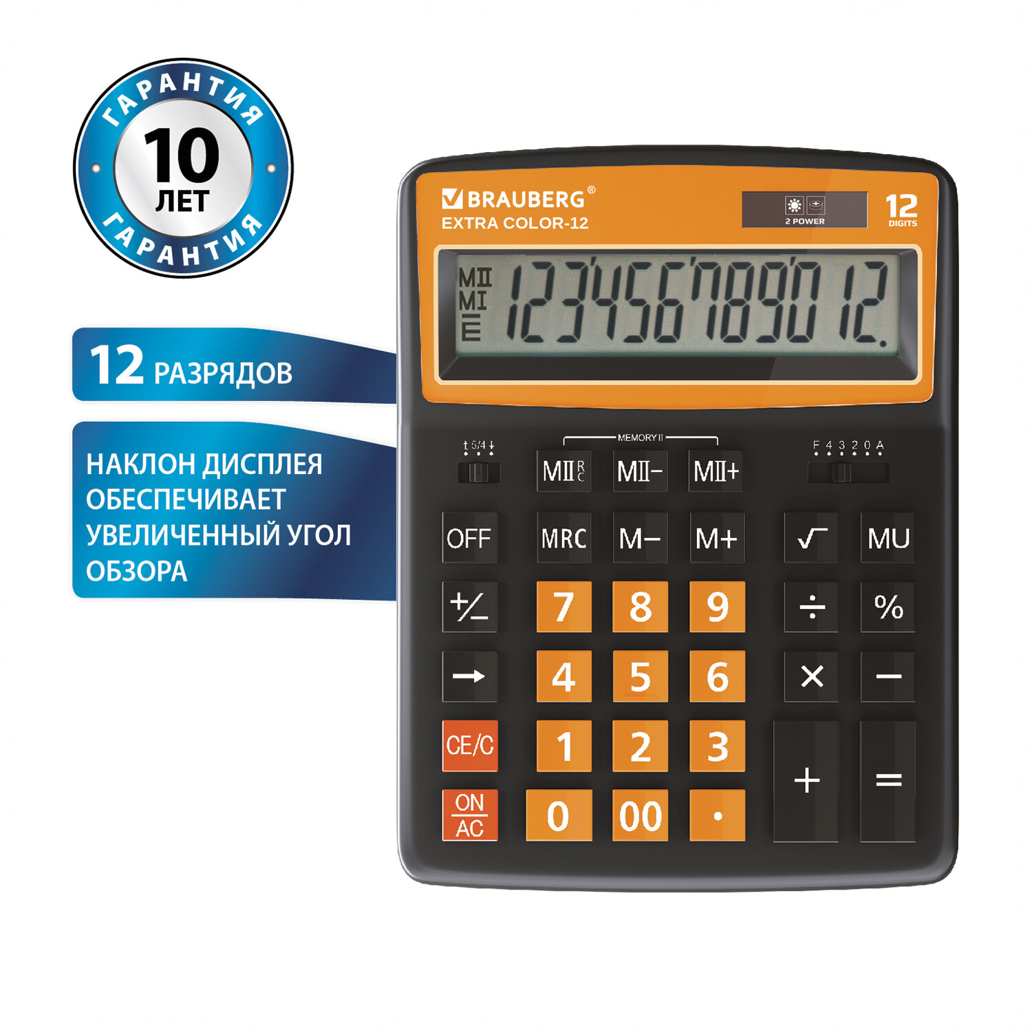 Калькулятор настольный BRAUBERG Extra COLOR-12-BKRG, 12-разрядный, однострочный экран, черный/оранжевый (250478), COLOR-12-BKRG