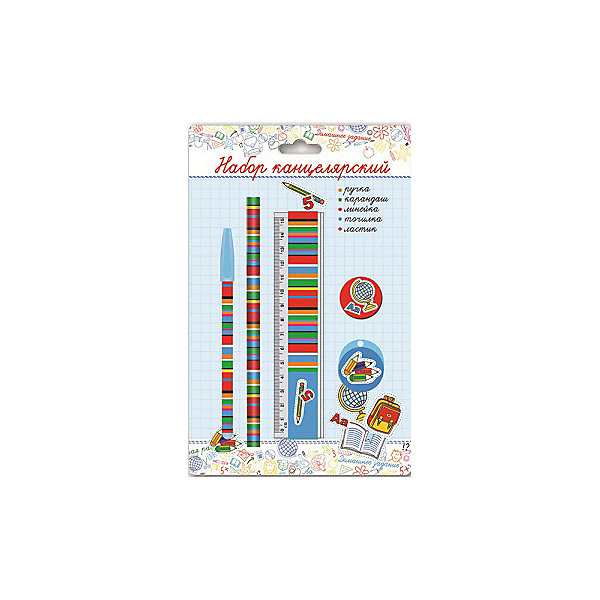 Канцелярский набор в блистере В ШКОЛЕ (1 ручка шарик. (синяя), 1 ластик диаметром 35мм, 1 точилка для карандашей диаметром 35мм, 1 пластиковая линейка длиной 150 мм, 1 круглый заточенный чернографитный карандаш в древесной оболочке твердости HB)