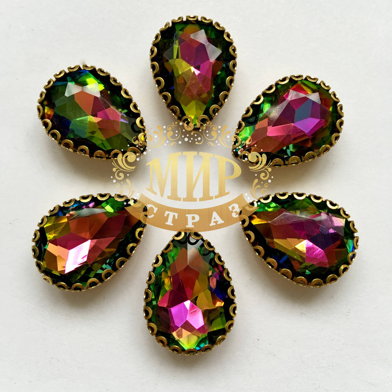 Хрустальные капли, посаженные в ажурную оправу золотого цвета. Размер 13х18мм. Цвет Rainbow Такие стразы в цапах выглядят как обшитые золотым бисером, что в некоторых случаях может существенно сэкономить ваши силы и , что не мало важно, время. Такие хрустальные капли в ажурной оправе подойдут для декорирования ободков ( обручей для волос), для создания модных брошей, колье и аксессуаров.
