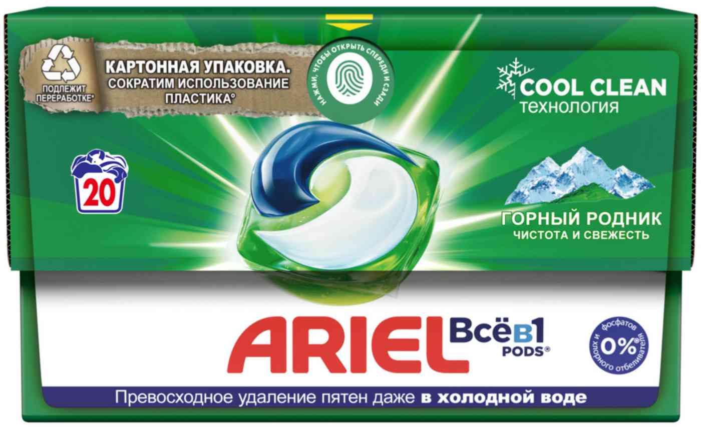 Капсулы для стирки Ariel Горный Родник 28 штук подходят для стирки белого и цветного белья. Благодаря уникальному многосекционному дизайну, превосходное очищение еще никогда не было удобнее. Каждая капсула содержит комплекс мощных активных ингредиентов для эффективного отстирывания. Все компоненты уже дозированы в оптимальной пропорции в 100 % водорастворимой пленке. Достаточно лишь добавить капсулу в барабан стиральной машины до загрузки белья. Ariel капсулы содержат высокую концентрацию очищающих веществ: одной капсулы хватит для стирки 4-5 кг белья – для стирки того же количества потребовалось бы 65 мл геля для стирки Ariel.Преимущества жидкого средства для стирки Ariel:- Прекрасно отстирывает сложные пятна даже при температуре 20 °C;- Невероятная чистота в одной капсуле для стирки;- Обеспечивает безупречное отстирывание и яркость белого;- Превосходная чистота даже при 20 °C;- Простота использования: не нужно отмерять и наливать;- Не содержит фосфатов и хлорных отбеливателей.