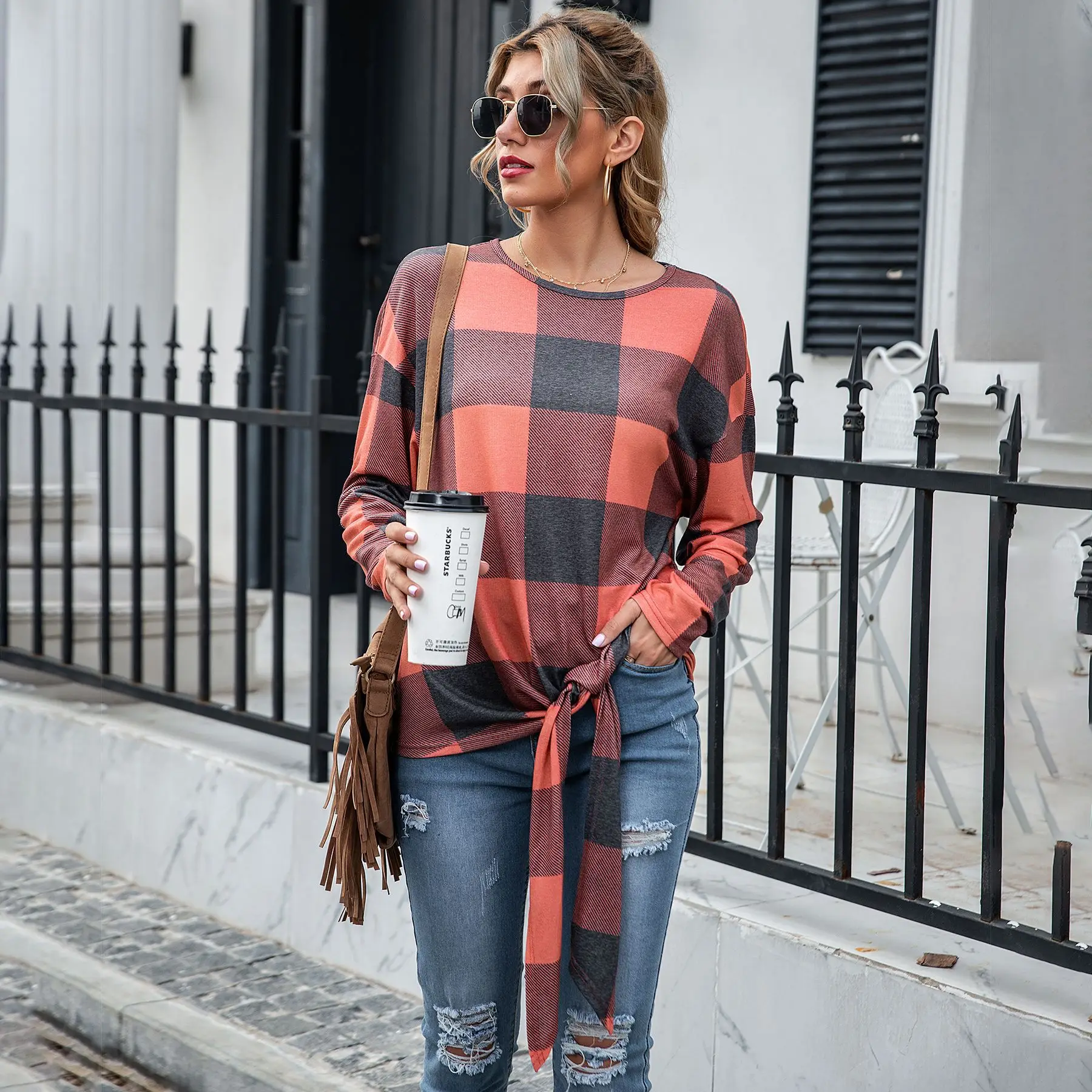 Fashion Casual Plaid T-shirts 3 colors Women Spring Autumn O-Neck Long Sleeve Loose Tops Elegant Office Large Size T-shirt 2021