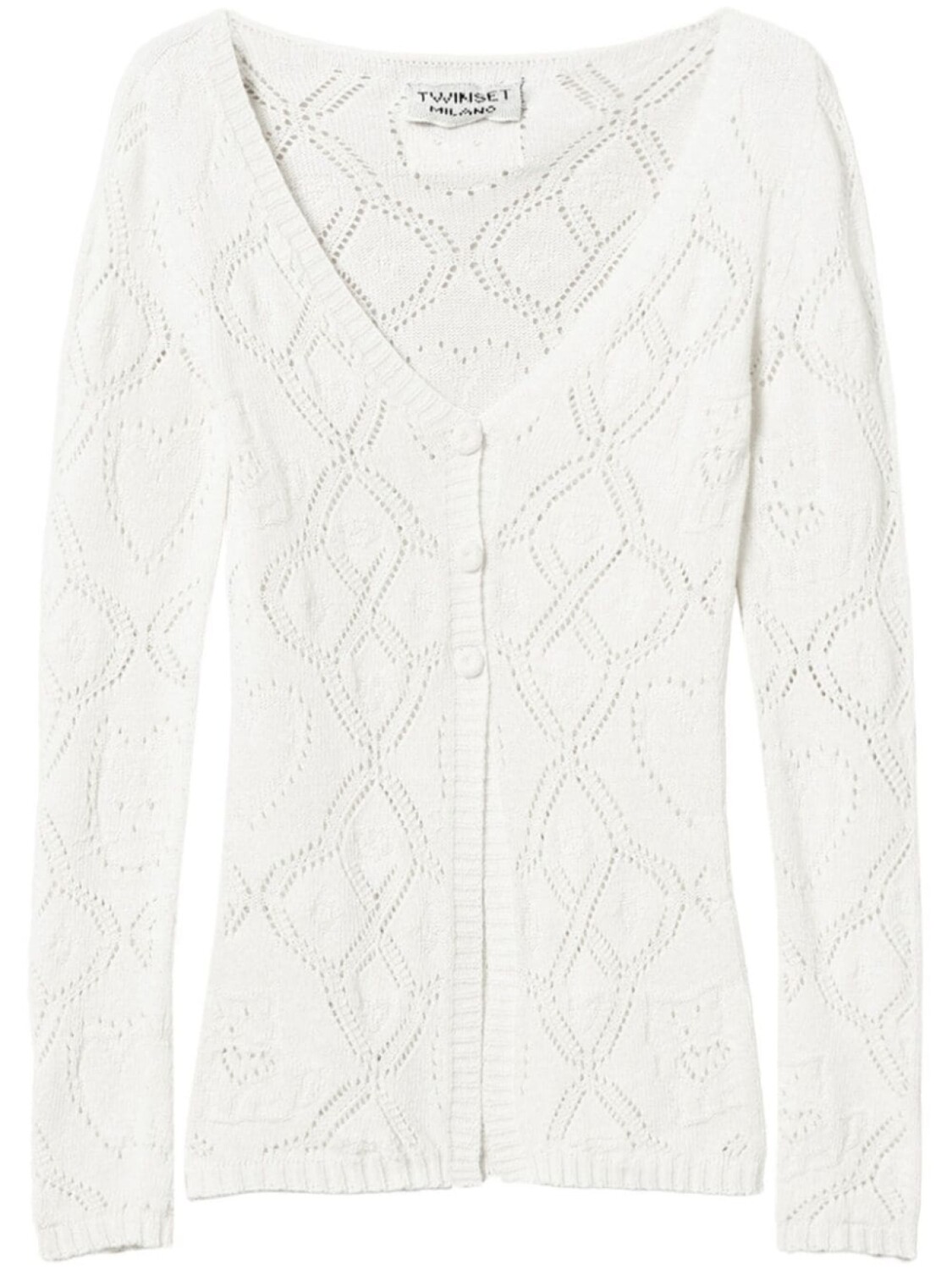 Подробнее о товаре: • белый • вязаный дизайн • кружевное вязание • застежка на пуговицах спереди • отделка в рубчик • V-образный вырез • длинные рукава • прямой подол