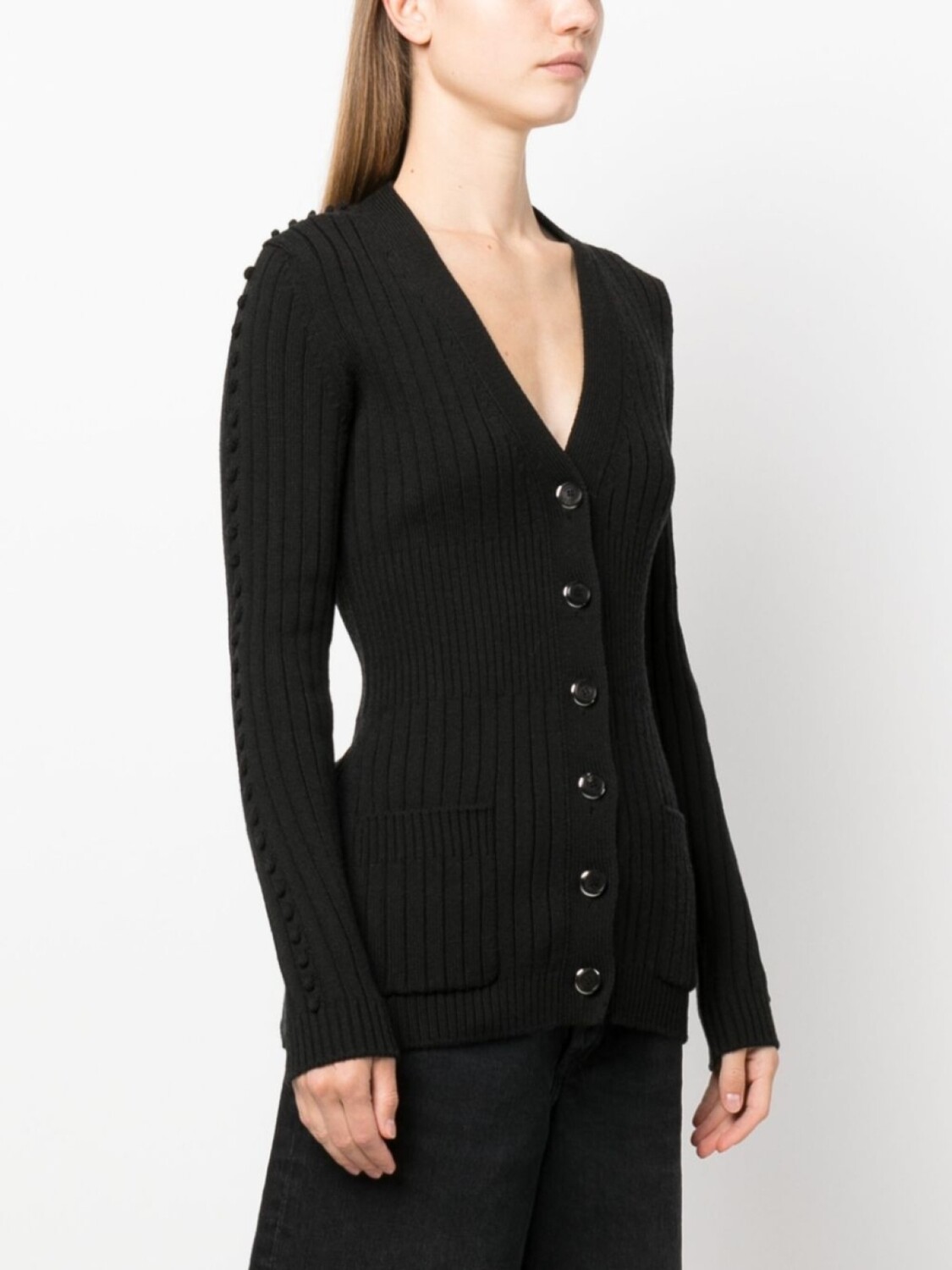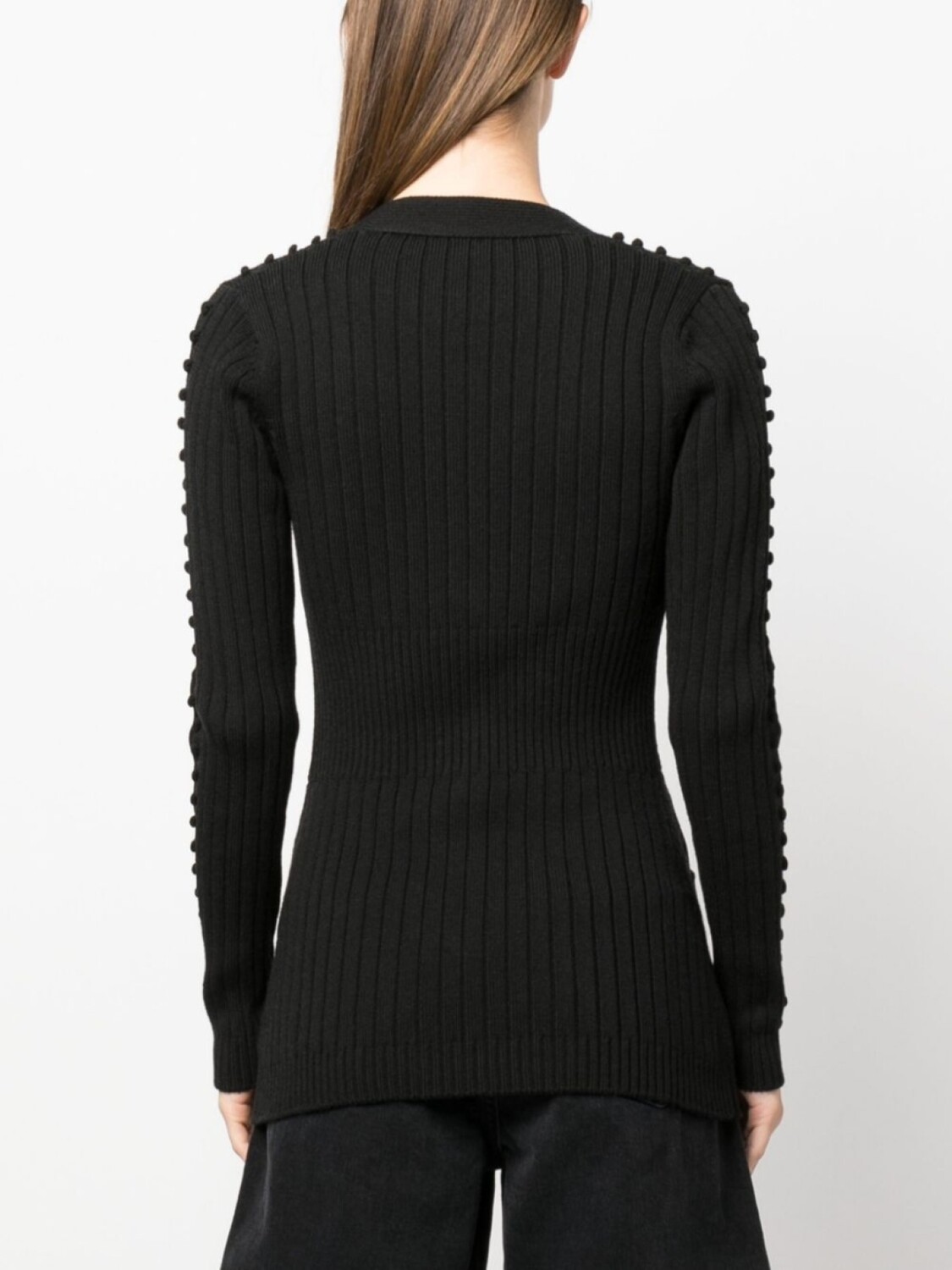 Черный, шерсть, трикотаж в рубчик, помпоны, V-образный вырез, застежка на пуговицах спереди, длинные рукава, два накладных кармана спереди и прямой подол.