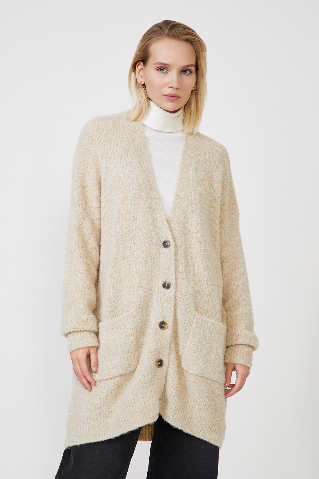 Удлинённый кардиган на пуговицах - незаменимая в повседневном гардеробе вещь. Трендовый силуэт оверсайз с актуально спущенными линиями пройм поможет вам создать стильный аутфит. В начале осени кардиган выступит в качестве верхней одежды, а с приходом холодов отлично справится с ролью дополнительного греющего слоя. Благодаря комфортной длине кардиган можно сочетать как с джинсами, так и с платьями. Для изготовления модели была выбрана пряжа букле, чтобы сделать материал более уютным и выразительным. Кардиган дополнен двумя накладными карманами по бокам.Кардиган выполнен из тёплого вязаного трикотажа. Шерсть в составе отлично согревает в непогоду, даря вам своё натуральное тепло. Добавление полиамида делает трикотаж прочнее, благодаря чему модель дольше сохраняет аккуратный внешний вид. Обратите внимание: чтобы изделие радовало вас своим качеством, стирайте его в бережном или ручном режиме при температуре не выше 30 градусов.
