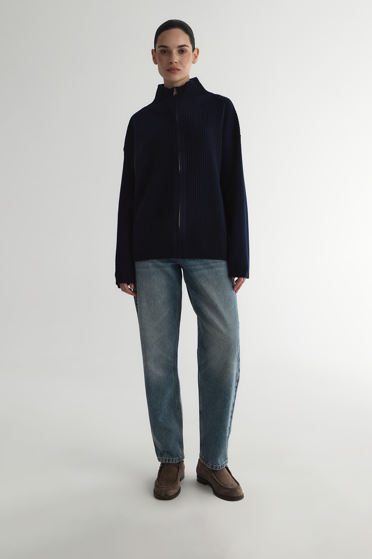 Кардиган на молнии объемного силуэта с широкими прямыми рукавами и отложным воротником. Сочетание шерсти и кашемира делает кардиган очень мягким и теплым. Универсальная модель для уютных и многослойных образов.