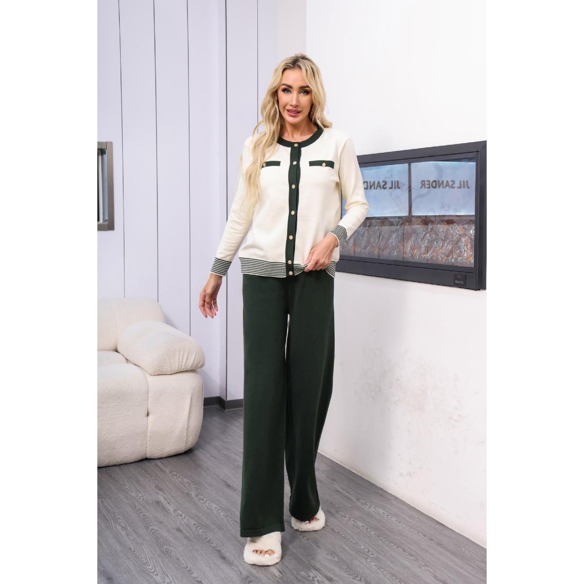 Кардиган с контрастными полосками и круглым вырезом, однобортный, с длинными рукавами, универсальный трикотажный комплект из двух предметов One Size зелёный