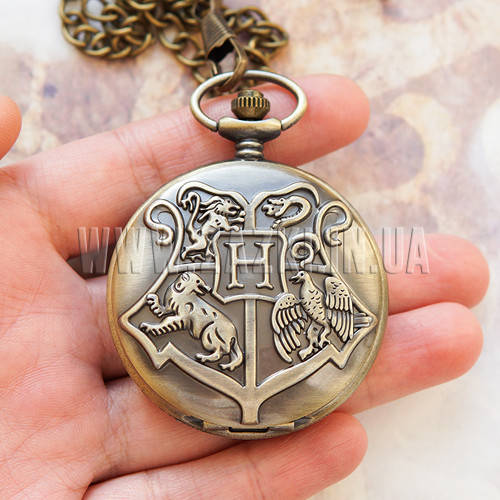 Карманные часы на цепочке с изображением герба школы чародейства Hogwarts на крышке. Часики раскрываются и работают от батарейки, которую можно легко заменить при необходимости.