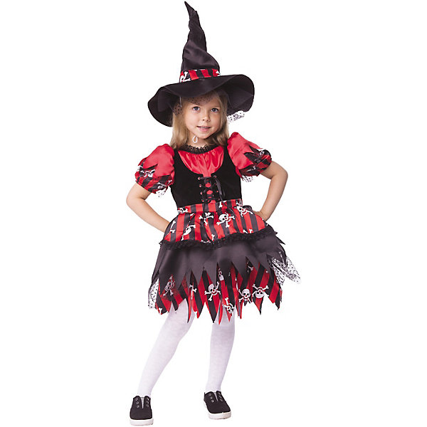 Стильный карнавальный костюм "Ведьмочка" понравится любительнице ярких и веселых праздников. Платье выполнено в ярко-красной цветовой гамме с принтом, дополнено черной пришивной жилеткой, пышность юбки придает небрежная многослойность и сетка. Образ завершит черная конусная шляпа.