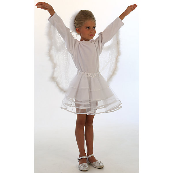 Костюм состоит из белой бархатной кофточки с ажурными полупрозрачными гипюровыми крыльями. Крылья оторочены настоящим боа. Дополняет костюм многоярусная пышная юбка-пачка из окантованного фатина белого цвета на резинке. В комплект входит также укражение для волос из боа.