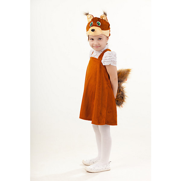 Верх 100% полиэстер; подклад: 35% хлопок+65%полиэстер Карнавальный костюм Белка Кнопочка выполнен из плюша коричневого цвета. Сарафан украшен шикарным пушыстым беличьим хвостом. Застегивается сарафан сзади на пуговицы.. Маска-шапочка в виде мордочки белочки с объемными ушками-кисточками.