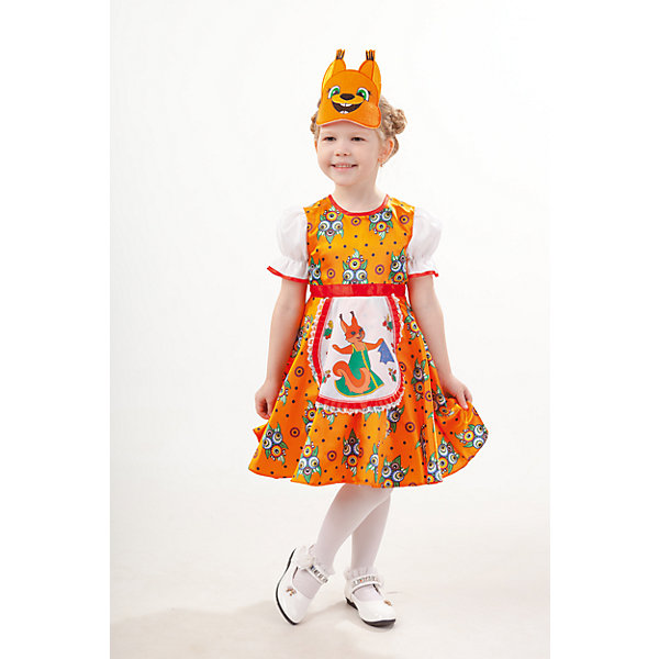 100% полиэстер Карнавальный костюм Белочка Анфиса, выполнен из принтованной ткани с нарядным фартуком. Дополняет образ маска. Платье с подъюбником. Застежка по спинке на молнии.