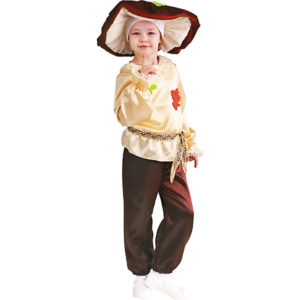 Карнавальный костюм Белый гриб универсален для девочек и для мальчиков. Он отлично подойдет для спектаклей любой сложности, а также карнавальных торжеств. В комплект костюма входит рубашка с брюками и шапка-гриб.