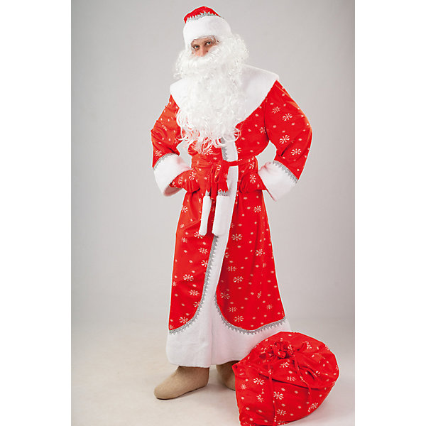100% полиэстер Нарядный костюм Дед Мороза выполнен из плюша. Шуба с отделкой из искусственного белоснежного меха. Обязательные атрибуты костюма борода, шапка, варежки и мешок.