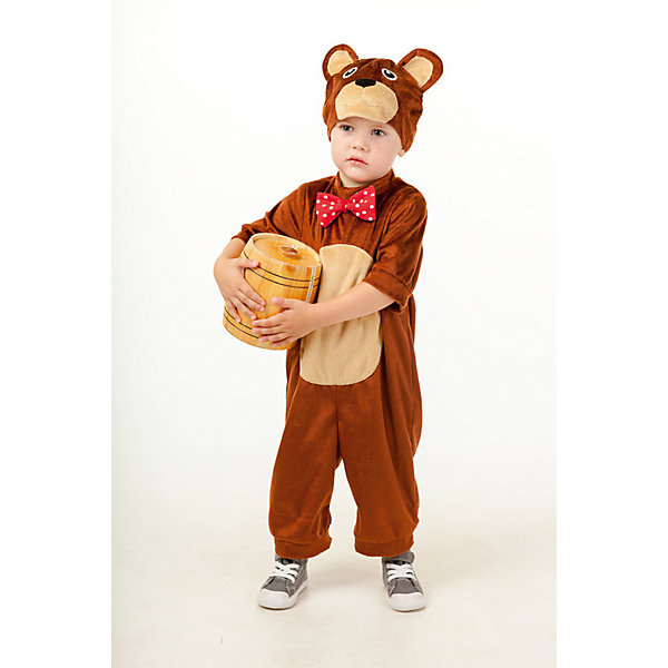 Верх 100% полиэстер; подклад: 35% хлопок+65%полиэстер Карнавальный костюм Медведь в виде комбинезона с длинными штаниками. Комбинезон коричневого цвета из плюшевого материала, застегивается на молнию на спинке. Маска-шапка в виде мордочки Медведя с объемными ушками. Комбинезон украшен красным бантиком в белый горошек на воротнике .