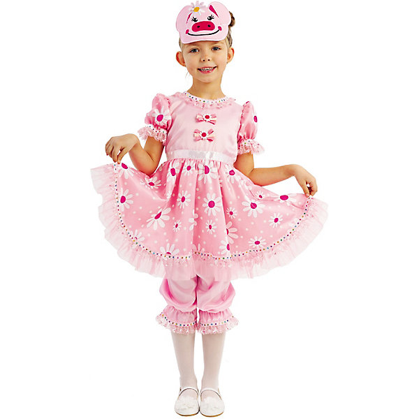 Карнавальный костюм "Свинка Дуся" очень милый и нежный. Нежность образу придает цветочный принт, пайетки и бантики. Пышность платью придает подъюбник. В комплект также входят панталончики, расшитые пайетками и кружевом и забавная маска на резинке. Маска очень удобна для юных модниц, она не повредит прическу и не принесет дискомфорта. Платье на застежке по спинке.
