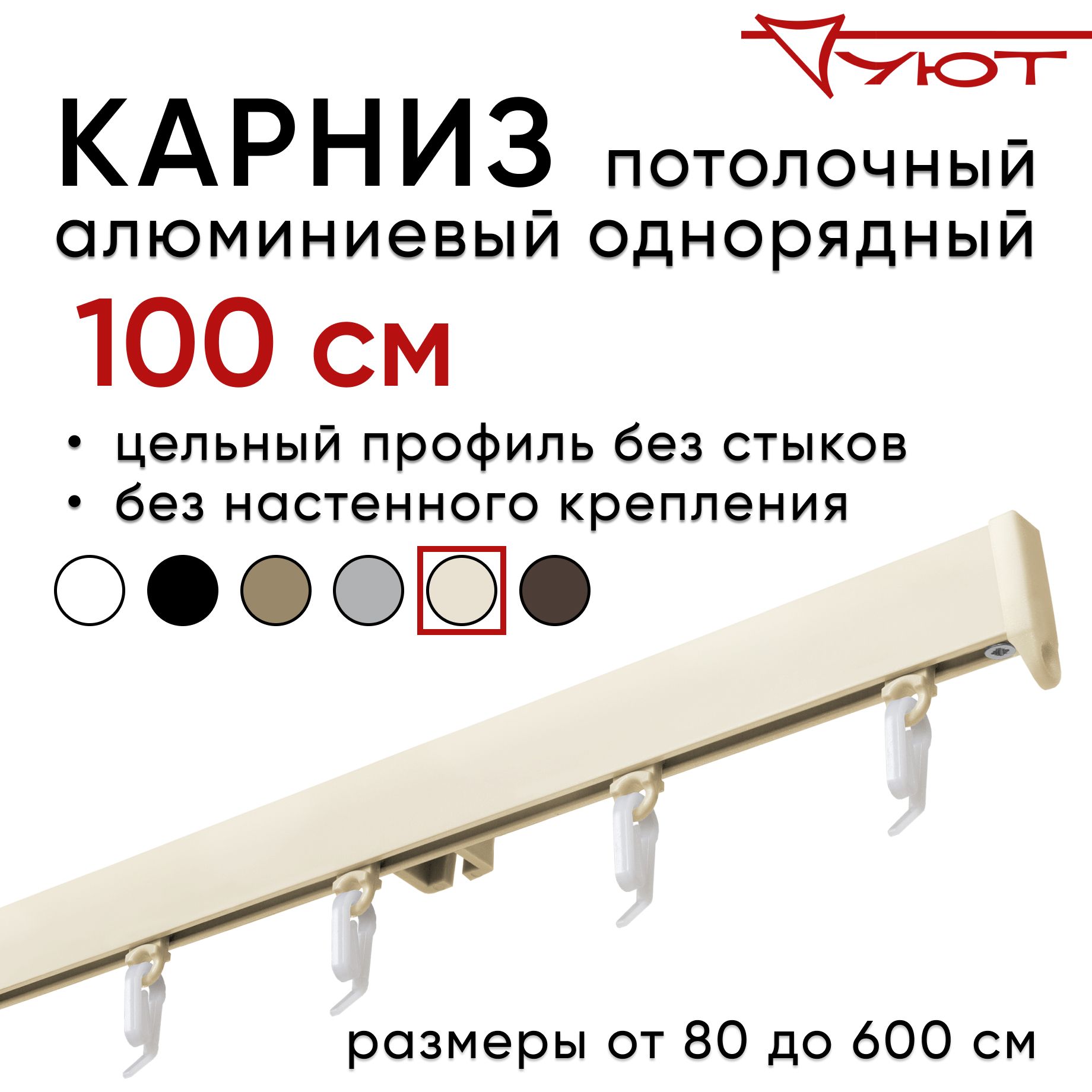 Карниз для штор однорядный потолочный алюминиевый ваниль УютПредназначен для установки на потолок или в нишу и подходит для любых раздвижных штор и тюля, можно использовать как скрытый карниз для натяжного потолкаГарантированная нагрузка - 6 кг на 1 метр. Металлический прямой профиль толщиной 0,8 см обеспечивает прочность, надежность, лёгкость и плавность движения бегунков по всей длине карнизаГардина под потолок подойдет для ниш, зонирования пространства, установки на балкон. В комплекте идёт вся фурнитура - бегунки с крючками для шторной ленты, торцевые заглушки и крепежи для потолочного крепления