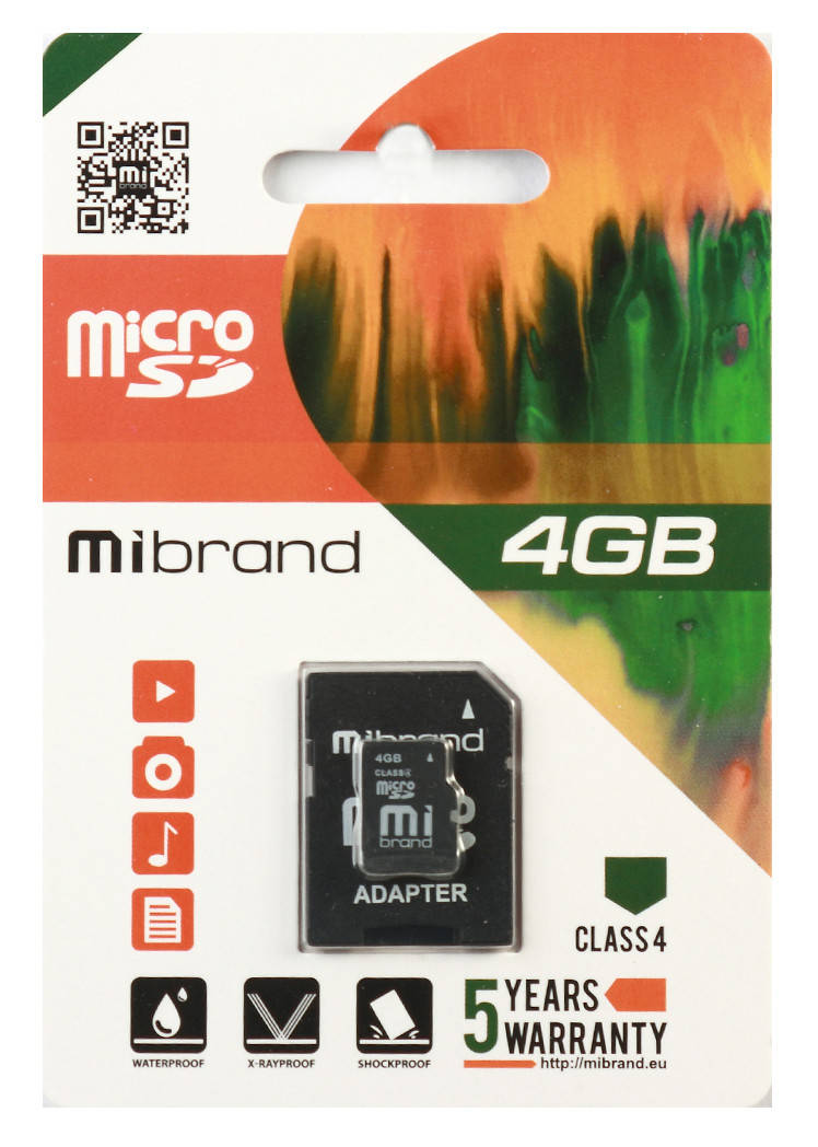 Карта памяти microSDHC Mibrand 4 Гб С4 это универсальный аксессуар, который Вы можете использовать в смартфонах, планшетах, камерах, тем самым создавая дополнительное место для хранения необходимых вам важных файлов, мультимедиа и ускоряя производительность устройств. Скорость передачи данных составляет 4 Мб / с, что удовлетворяет потребности повседневных приложений. Имеет отличную совместимость в соответствии со спецификациями SD Association. Данная модель успешно прошла испытания на ударопрочность, водонепроницаемость и устойчивость к рентгеновскому излучению.