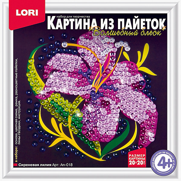 Картина из пайеток «Волшебный блеск Сиреневая лилия» - это замечательный набор для творчества, предназначенный для детей от 4-х лет. С помощью ярких пайеток и специальных гвоздиков ваш ребенок сможет создать красочную картину с ярким и блестящим цветком лилией. На помощь всегда придет пошаговая инструкция. Для облегчения задачи места для крепления пайеток на схеме отмечены соответствующими цветными кружочками. Прекрасная лилия на темном фоне и в красивой рамочке станет замечательным украшением Вашего дома или подарком для друзей. Занятия с данным набором развивают внимание, способствуют развитию мелкой моторики рук, воспитывают усидчивость.