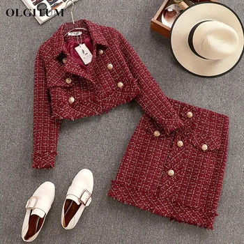 Women Set 2 Piece Skirt+Jacket Autumn Winter Tweed Lattice Jackets Double-breasted Cardigan Jacket Women Two Piece Sets