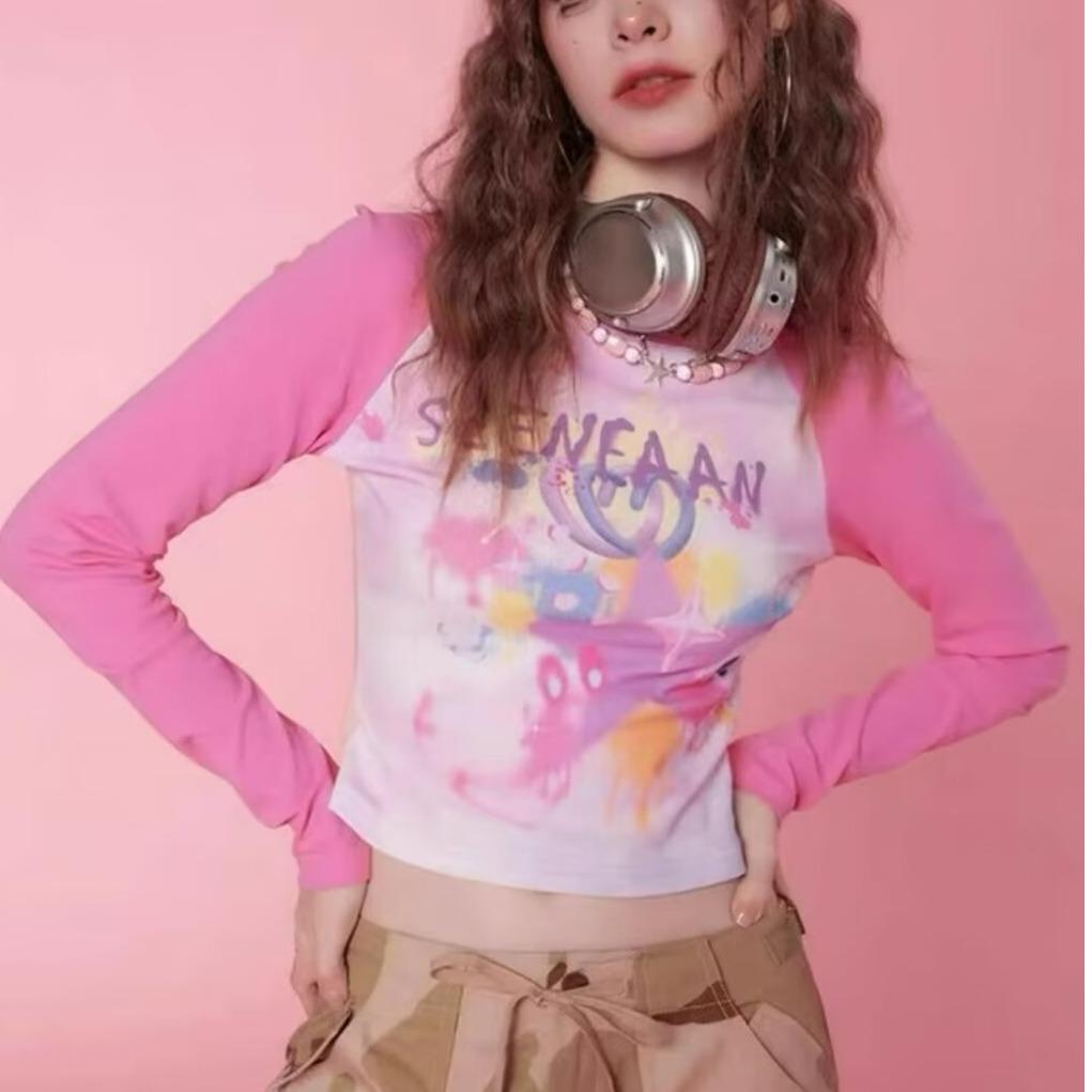 Y2k Harajuku уличная футболка женские японские лоскутные Kawaii милый мультяшный принт тонкие футболки укороченные топы мягкие гриль S розовый