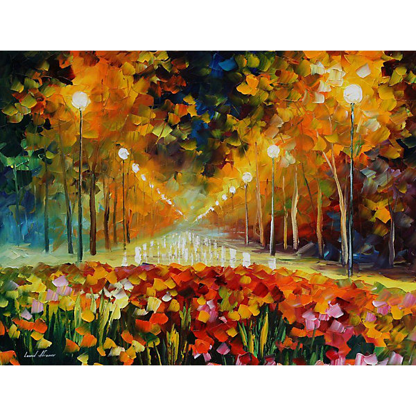 Красочная картина с красивой аллеей роз, дорожка, проходящая через вечерний парк освещена фонарями, спереди видна клумба цветов. Подбирать цвета не нужно, все необходимые уже в комплекте, а рисунок, как и краски, пронумерованы. Холст уже натянут на деревянный подрамник, а закончив рисовать готовый шедевр можно повесить на стену, используя специальные крепления.