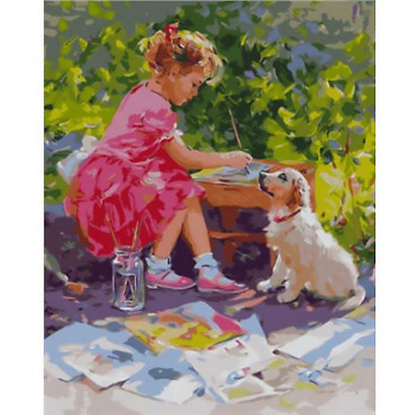На картине маленькая девочка в малиновом платье сидит во дворе и рисует картинки. Перед ней стол, где лежит листок, рядом у ног банка с кисточками, разбросаны другие рисунки. Щенок сидит, наблюдая за её действиями. Подбирать цвета не нужно, все необходимые уже в комплекте, а рисунок, как и краски, пронумерованы. Холст уже натянут на деревянный подрамник, а закончив рисовать готовый шедевр можно повесить на стену, используя специальные крепления.