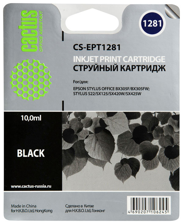 Картридж струйный Cactus CS-EPT1281 (C13T12814010), черный, совместимый, 10 мл, для Epson Stylus S22 / S125 / SX420 / SX425 / Office BX305