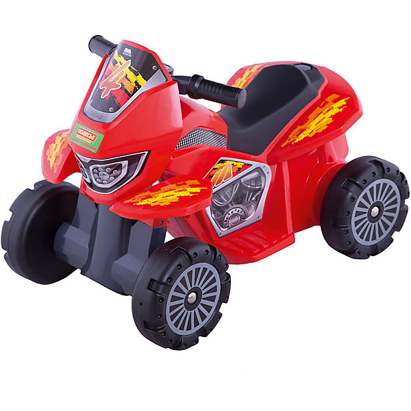 Квадроцикл красного цвета выполнен из пластика. На нем есть наклейки с изображением фар и внутренних деталей квадроцикла, что делает данное средство передвижения более реалистичным. От катания на данном квадроцикле ребенок получит много позитивных эмоций.