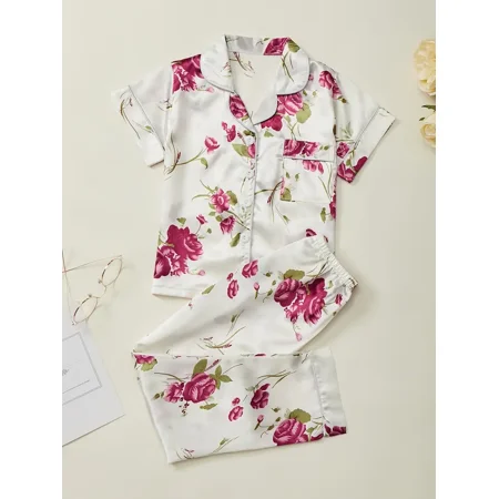 GEDER-FAGirls Pajamas Family Outfit Flowers Print Lapel Short Sleeve Top & Pants Set Kids Clothes