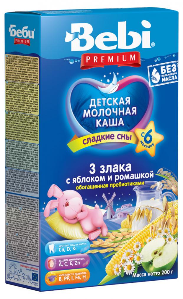 Каша молочная Bebi Premium Сладкие сны 3 злака с яблоком и ромашкой с 6 мес, 200 г