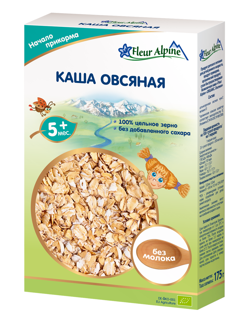 Богатая белковыми соединениями и клетчаткой, овсяная каша хорошо усваивается организмом. Продукт производится из цельных зерен, выращенных в органических сельских хозяйствах, без добавления молока, сахара и соли. Нежная консистенция способствует быстрому усваиванию. Овсяную кашку можно вводить в рацион малыша с 5 месяцев.