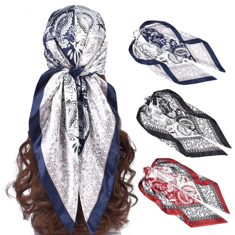 Квадратный шарф мусульманский хиджаб тюрбан бандана атласный шейный платок с принтом кешью Офисная Женская шаль 90x90 см шелковый шарф голов...