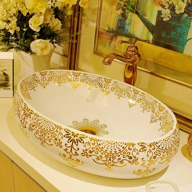 Керамическая Столешница, раковина, раковина, фарфоровые раковины, раковина для ванной, керамическая раковина, раковина с овальным золотым узором