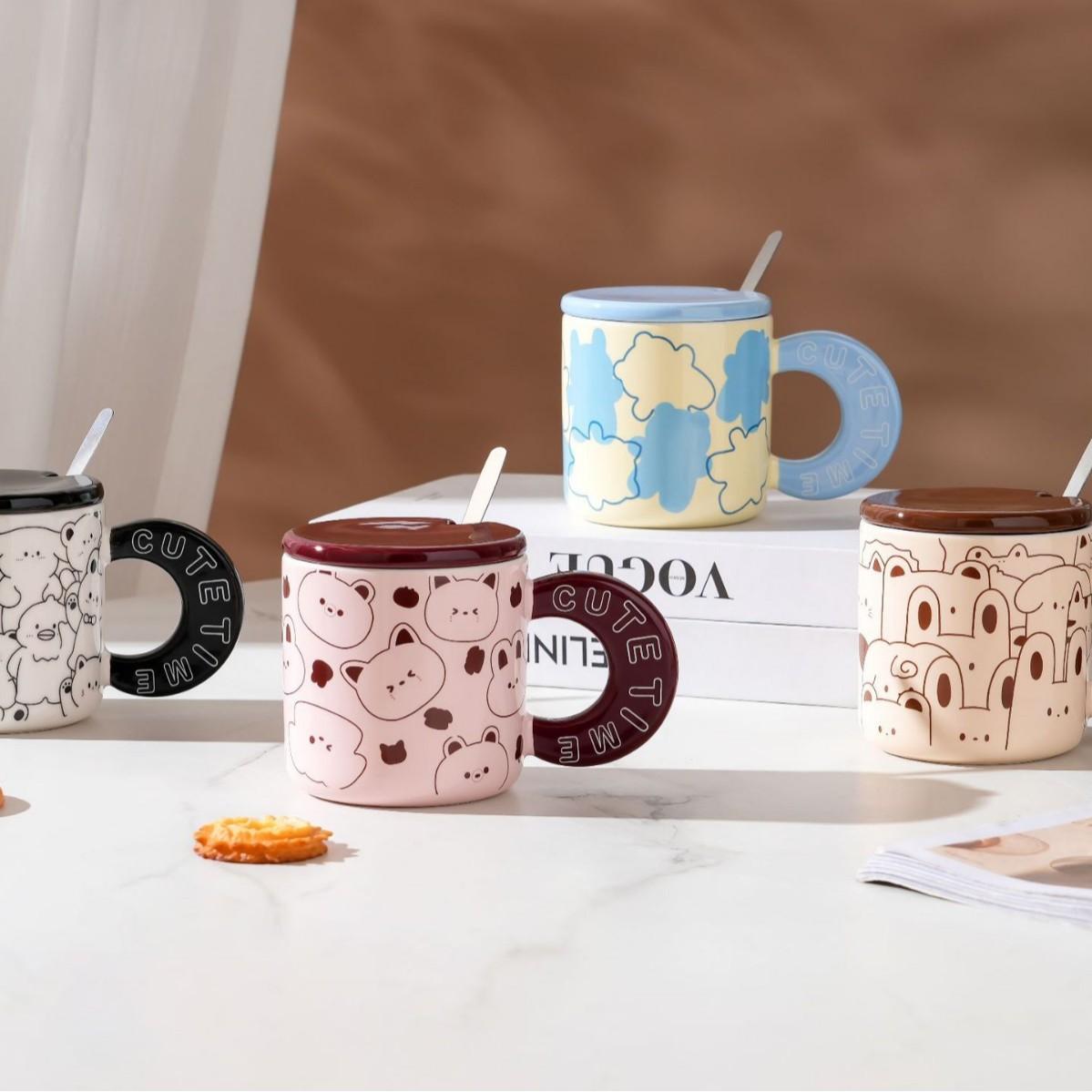 Керамическая чашка с изображением животных из мультфильмов, с крышкой и ложкой, дорогая кружка для пары, костюм для девушки, чашка для воды, небольшой подарок 350ML